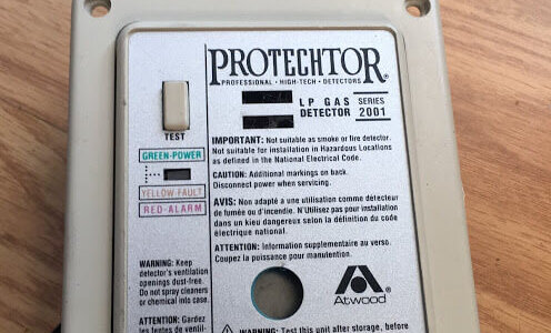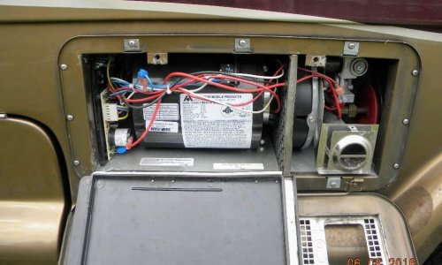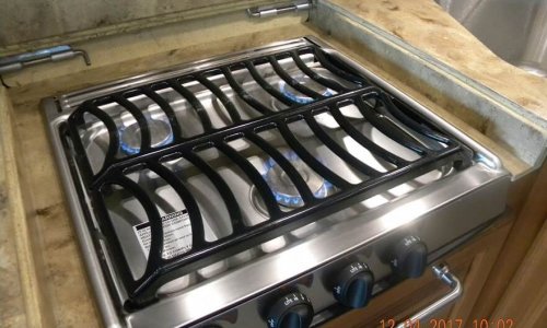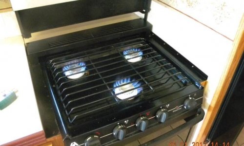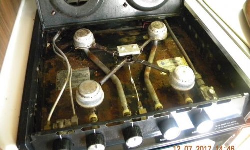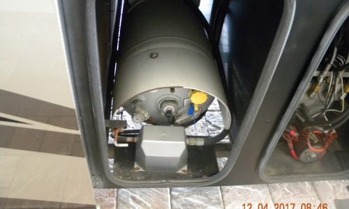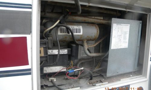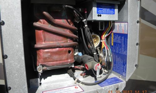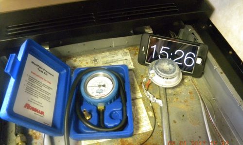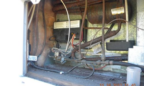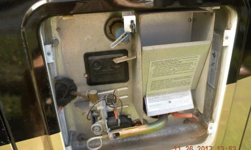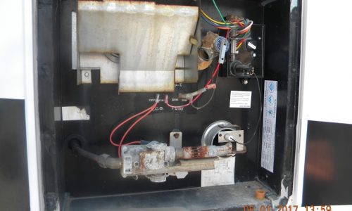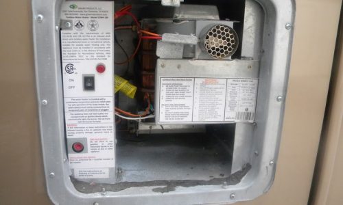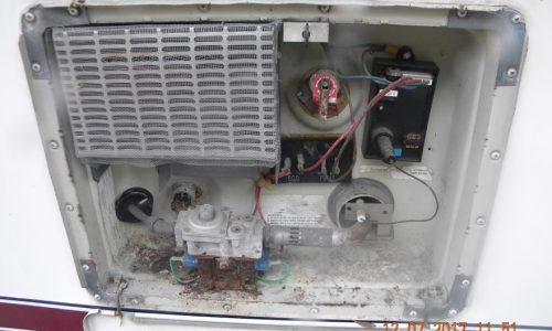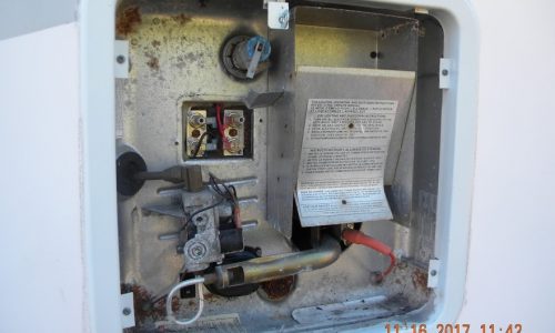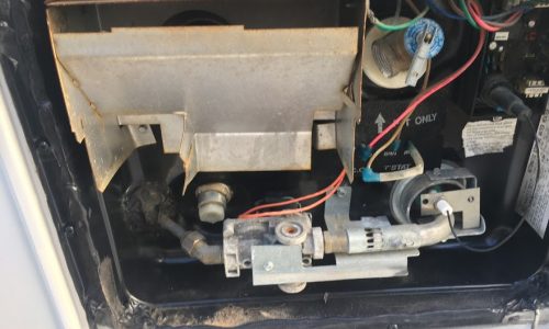 Locate and identify the water heater, brand model and capacity. Verify operation on gas and 120 Volt AC. Visually inspect burner assembly. Note presence or otherwise additional sealing around gas line.